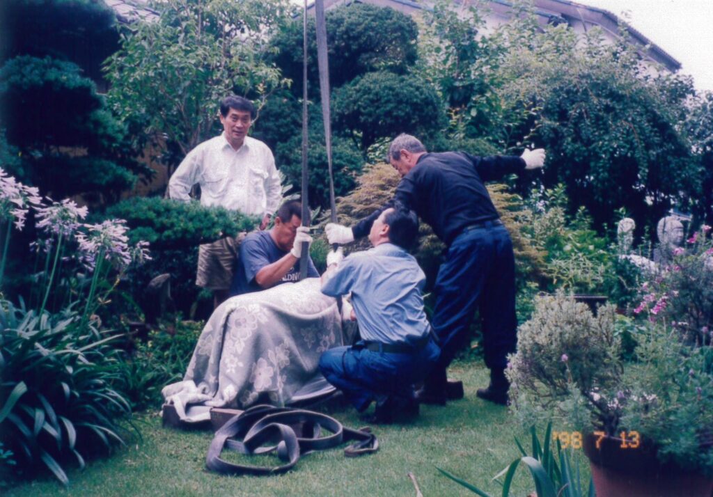 石彫羊対守護像を自宅より奉納